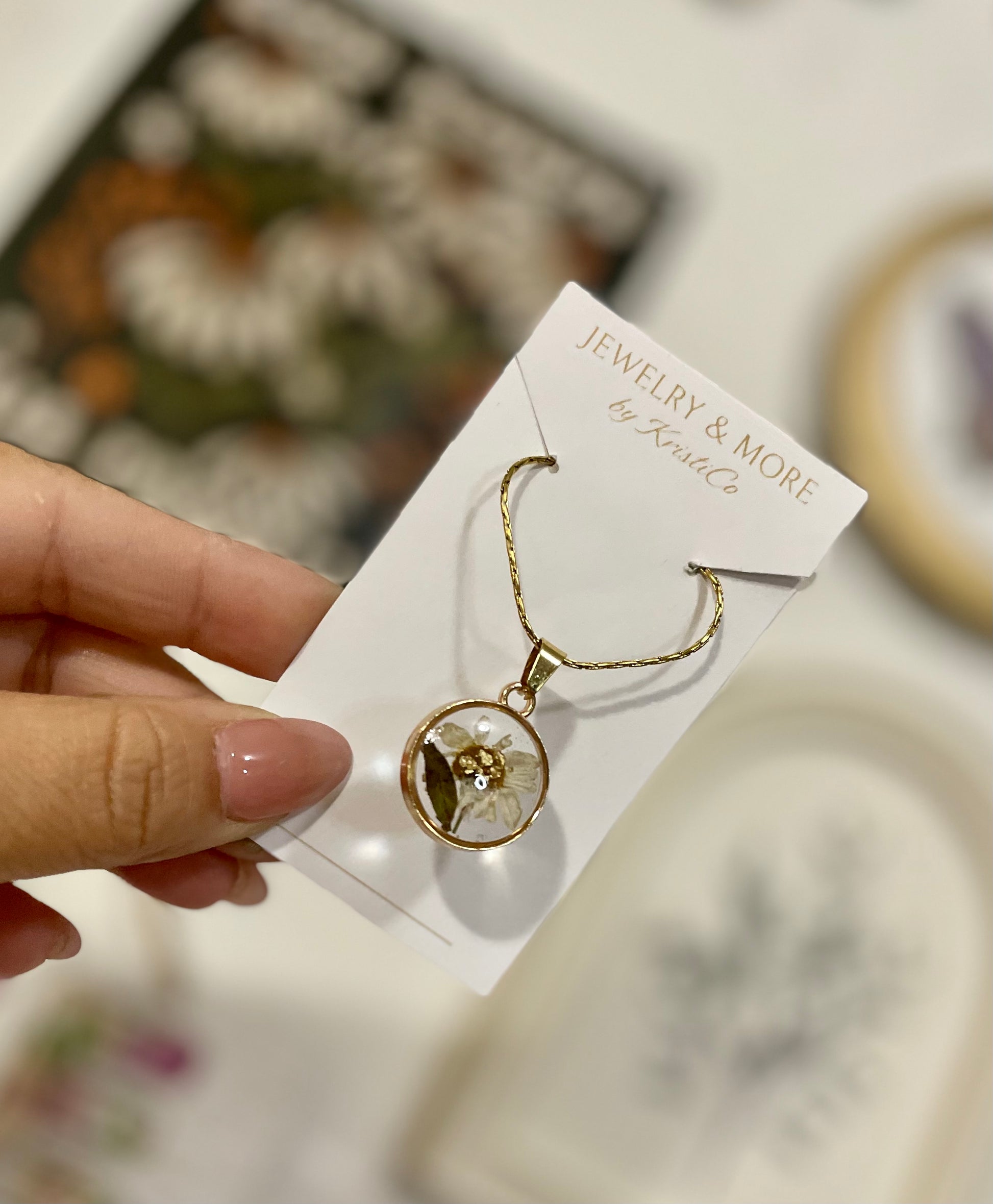 This Daisy Flower Necklace is perfect for adding a touch of elegance and class to any outfit. With its tarnish resistant gold chain and real daisy flower and ash leaf encased in clear resin, it is sure to make a statement. The perfect accessory for any occasion.
