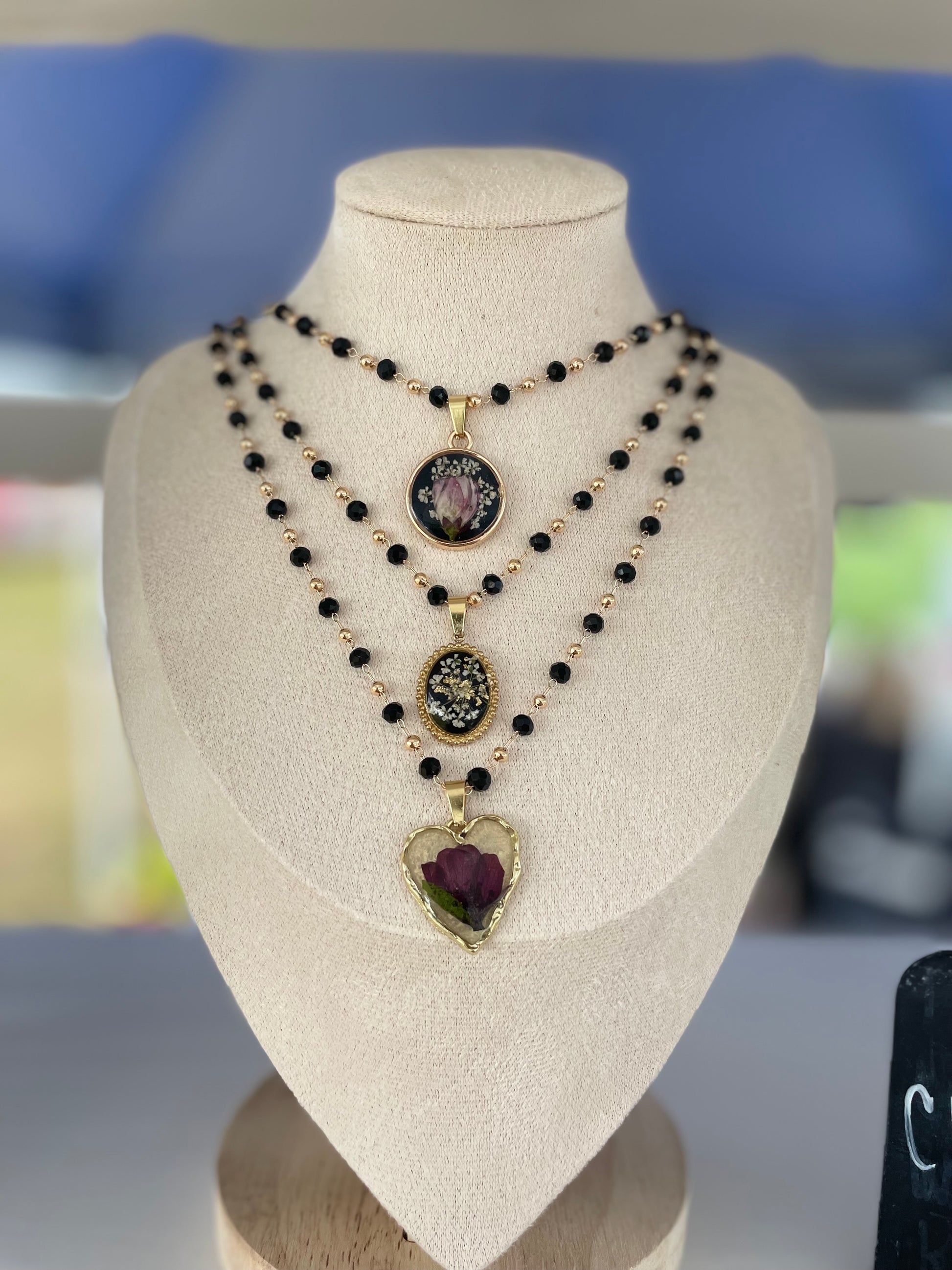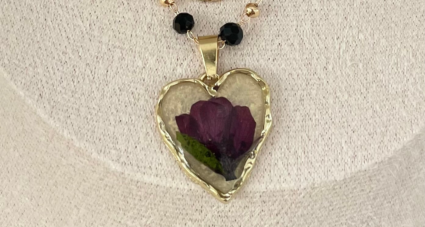 This autumn-inspired choker necklace features dark black and gold beads, accented with real dried flowers. Add a touch of nature and elegance to your look with this unique piece. Perfect for any outfit, this necklace is sure to make a statement.