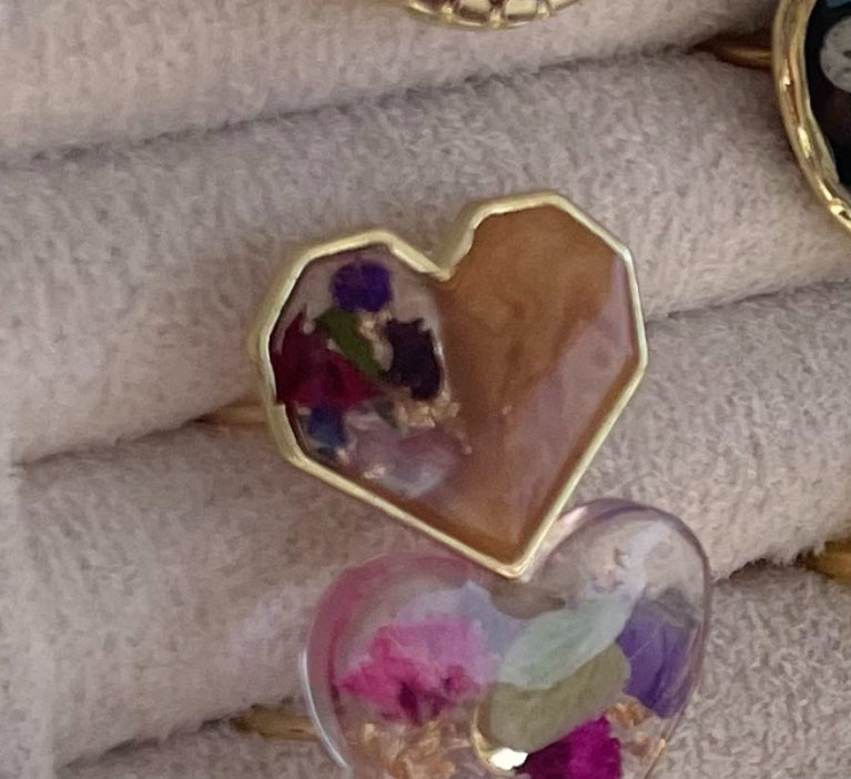 Tan and clear resin. Real dried peony and rose pieces. Band is adjustable.