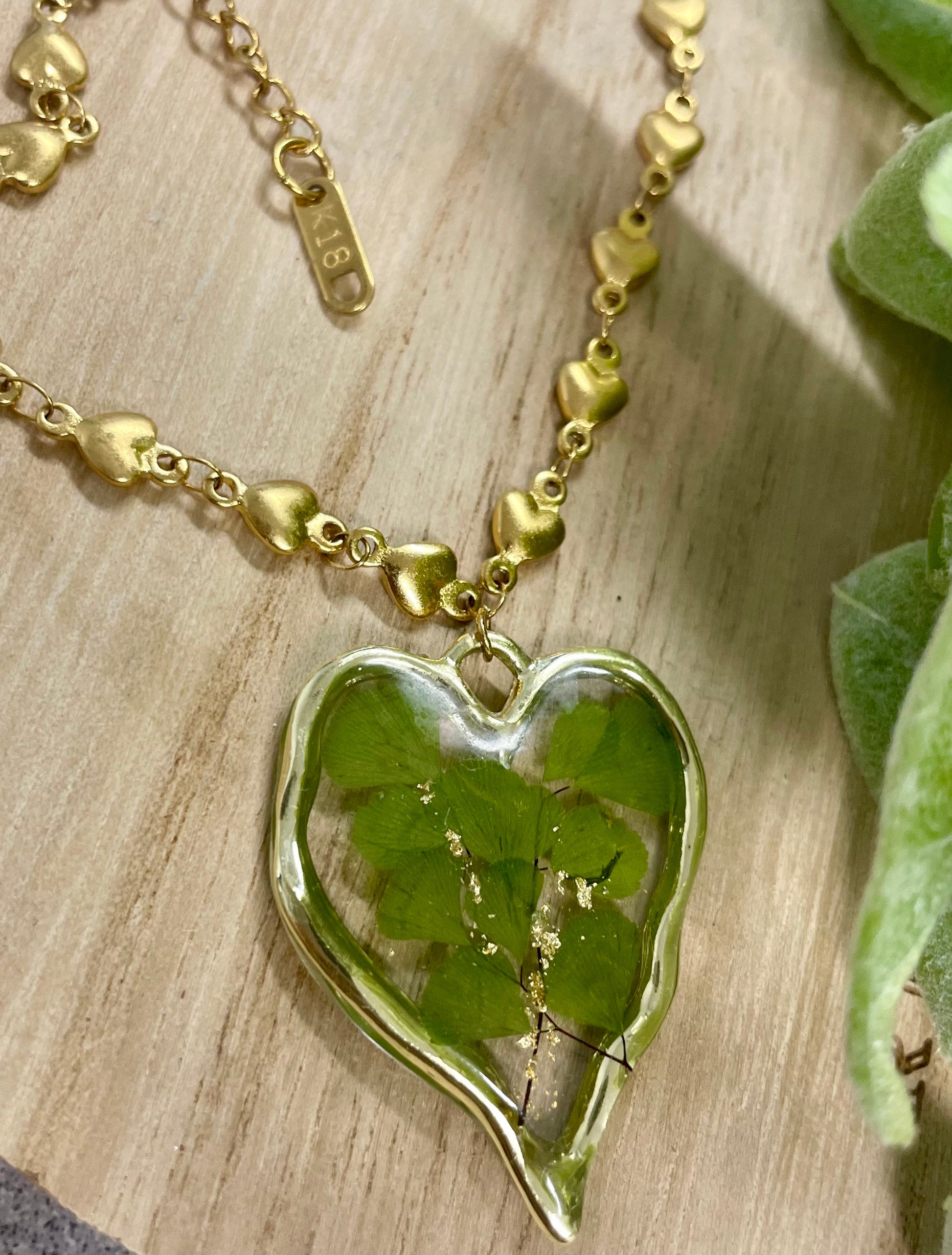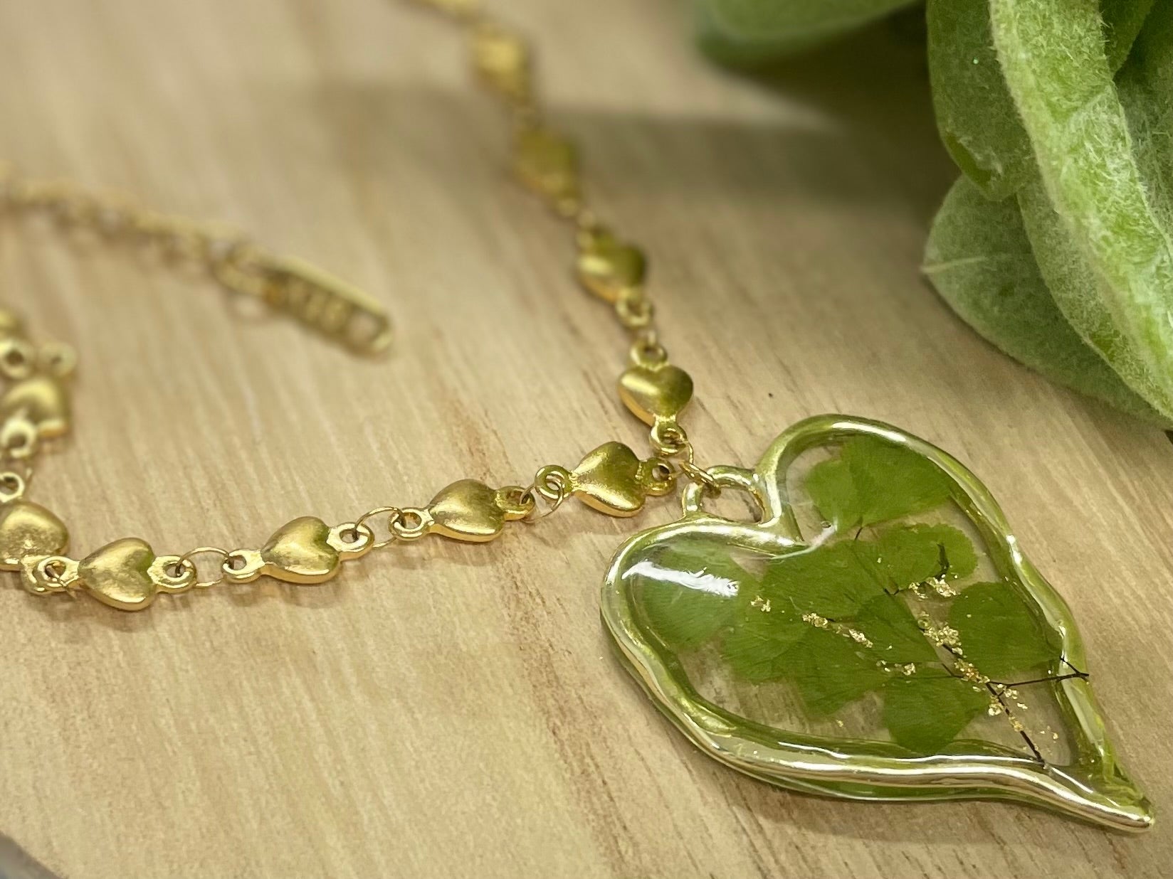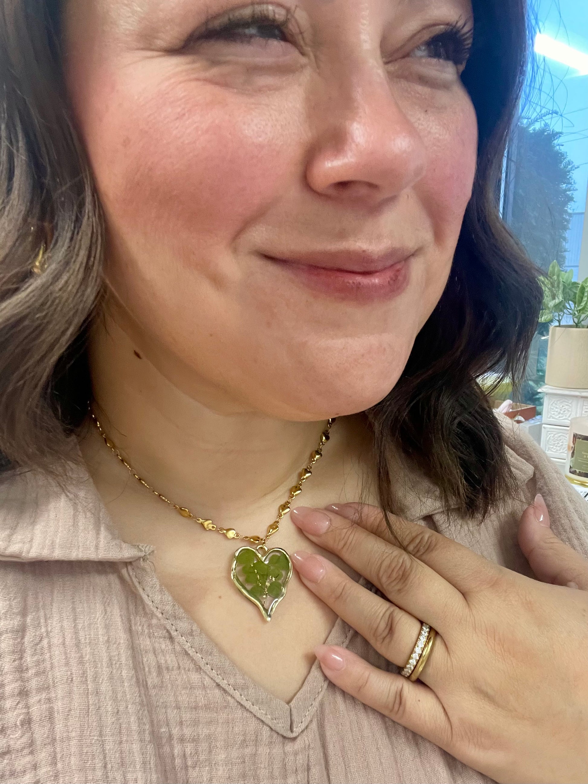 Real leaf and gold specs in a heart waterproof non tarnish 18k gold chain. Very lightweight and super chic! 16in-20in