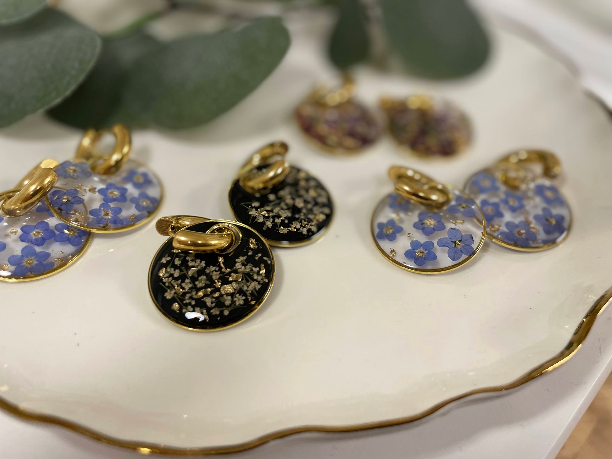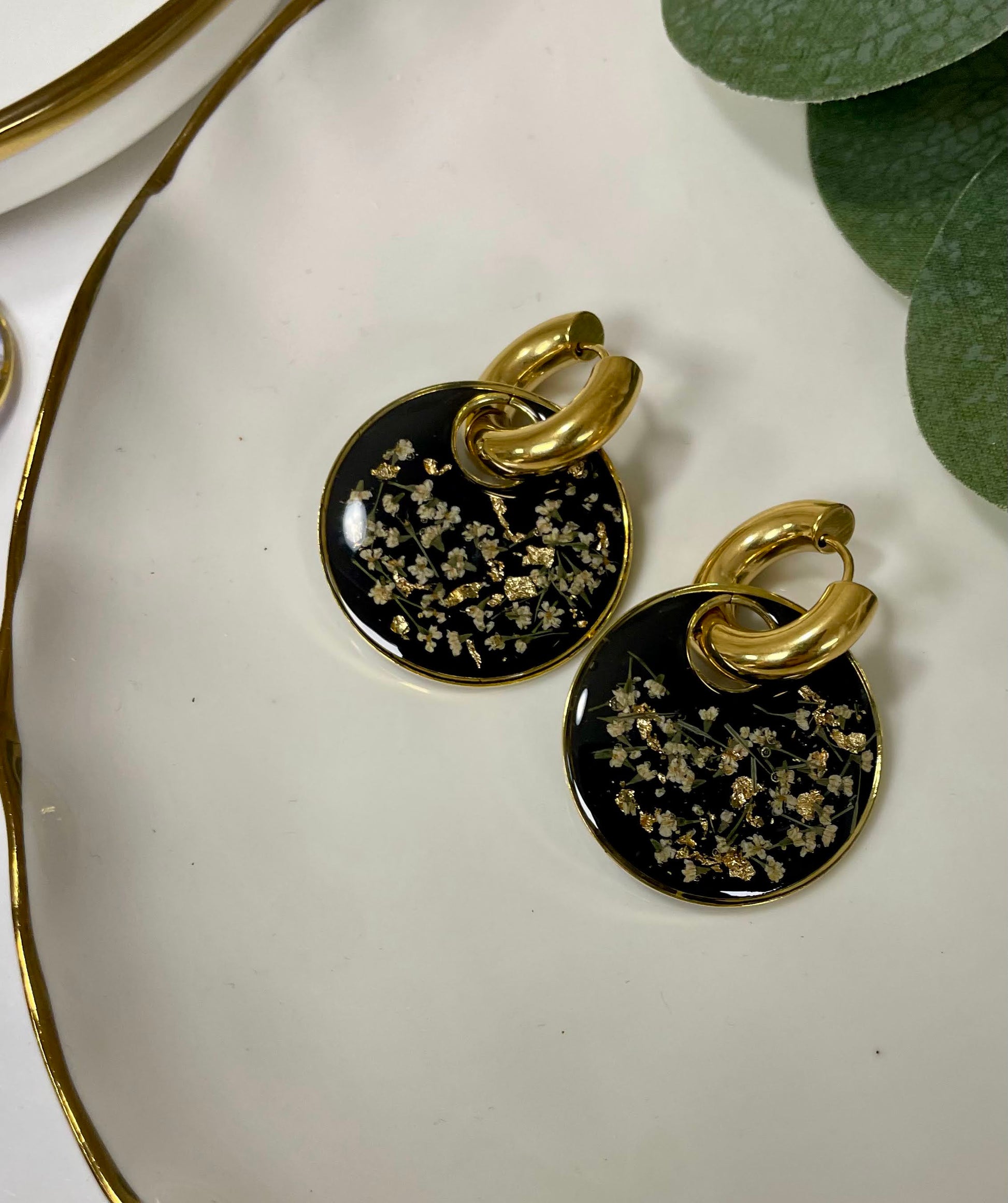 Bold yet romantic, the Noire Fleurette Earrings are where Parisian elegance meets modern edge. Real dried florals are delicately preserved in glossy black resin, accented with flecks of gold for a striking, timeless contrast.