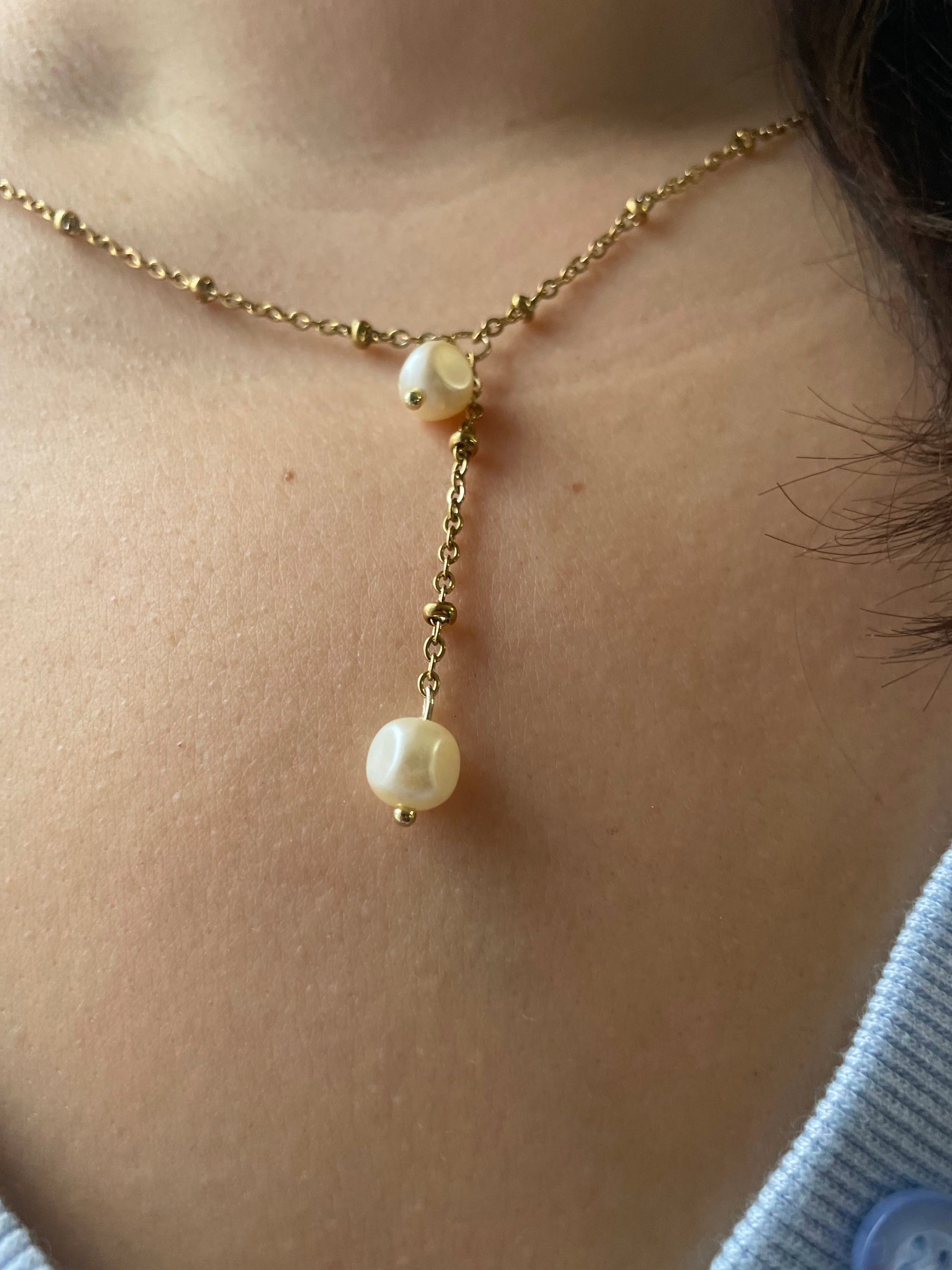18k pvd gold beaded chain. 16-18 in freshwater pearl drops. Waterproof.