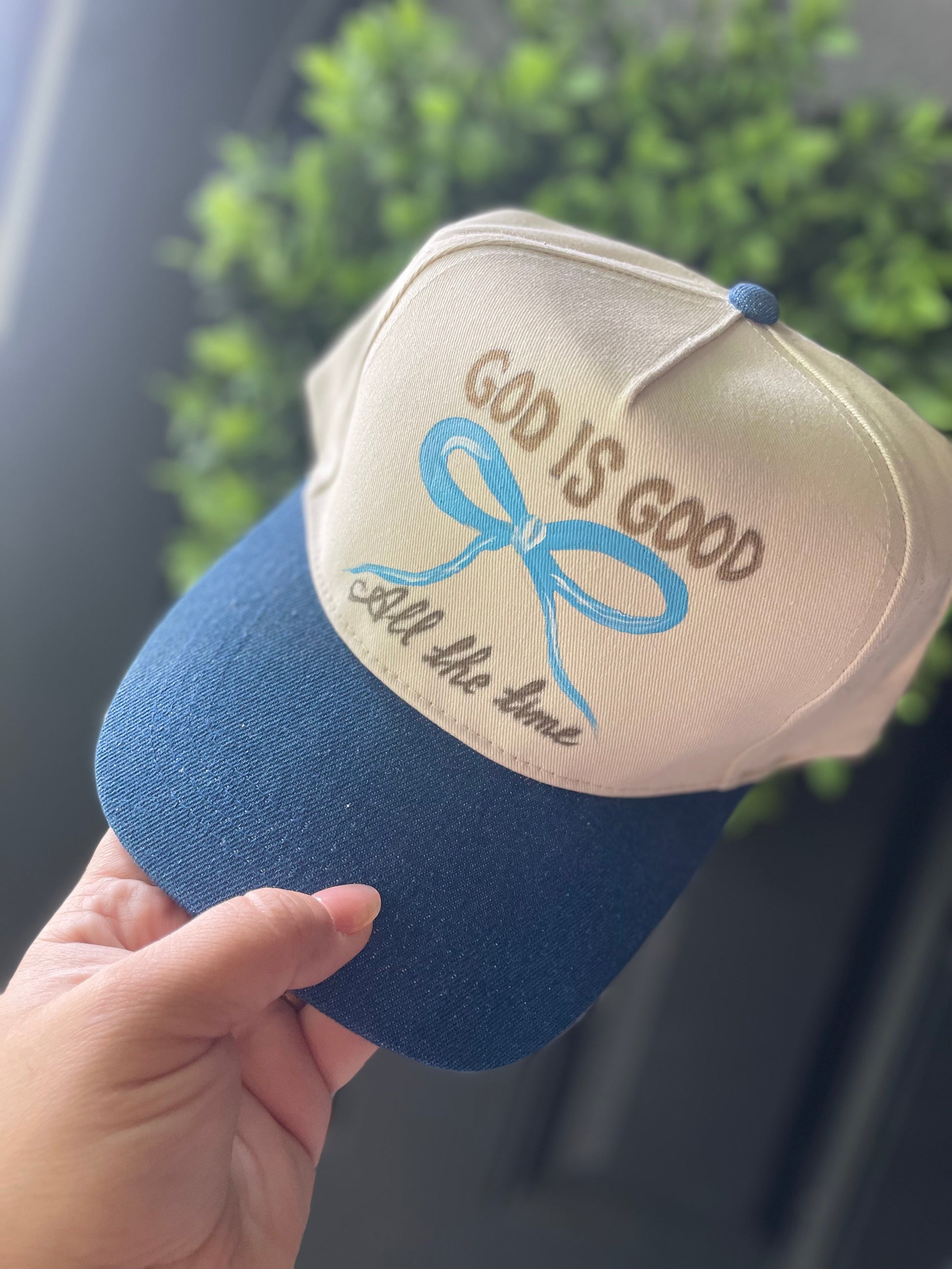 Rock this rad Two-Tone Jean Trucker Cap, sealed with UV paint and water protectant. Show off your playful spirit with style, while keeping your head protected. Good vibes only with God Is Good.