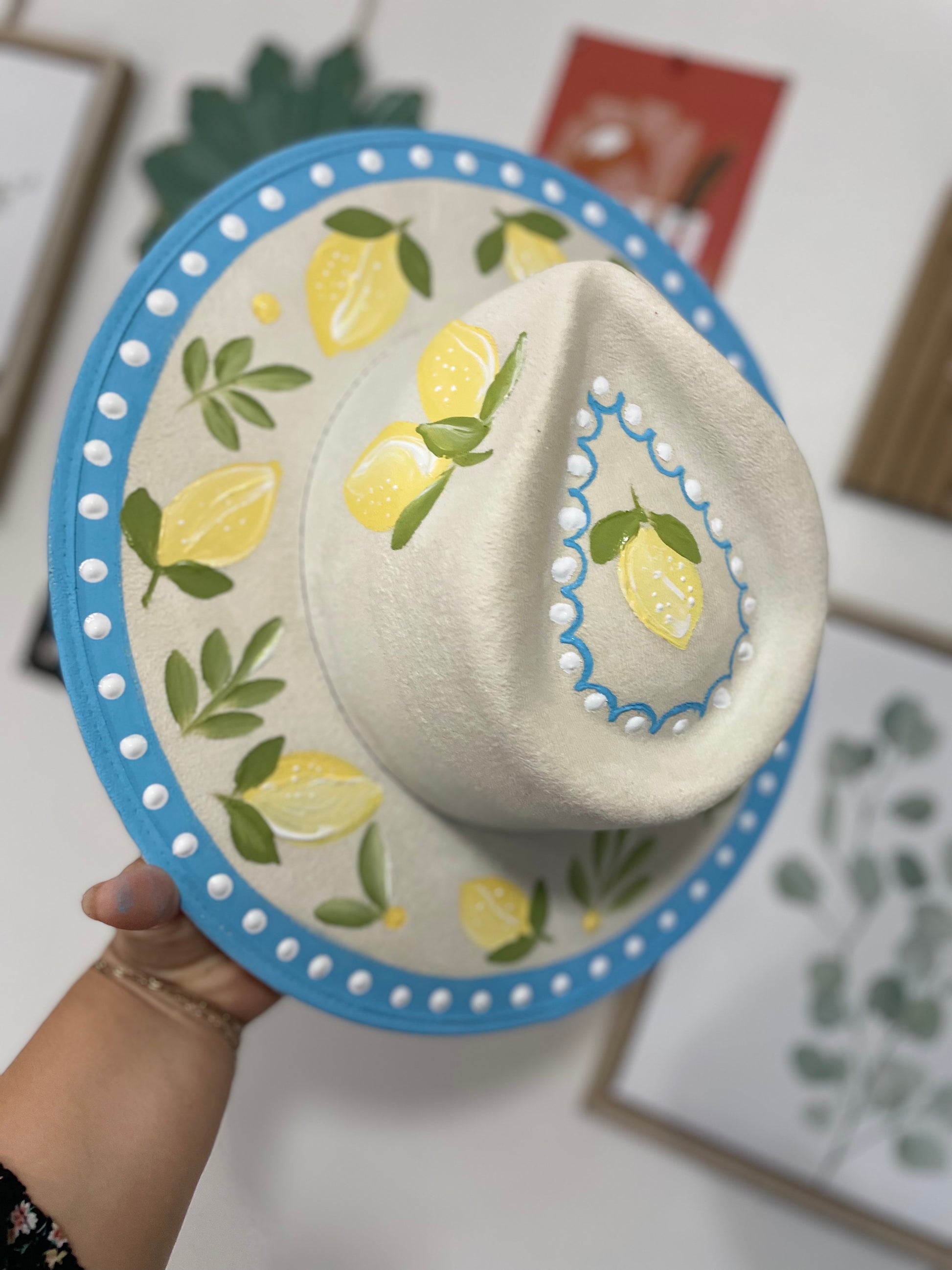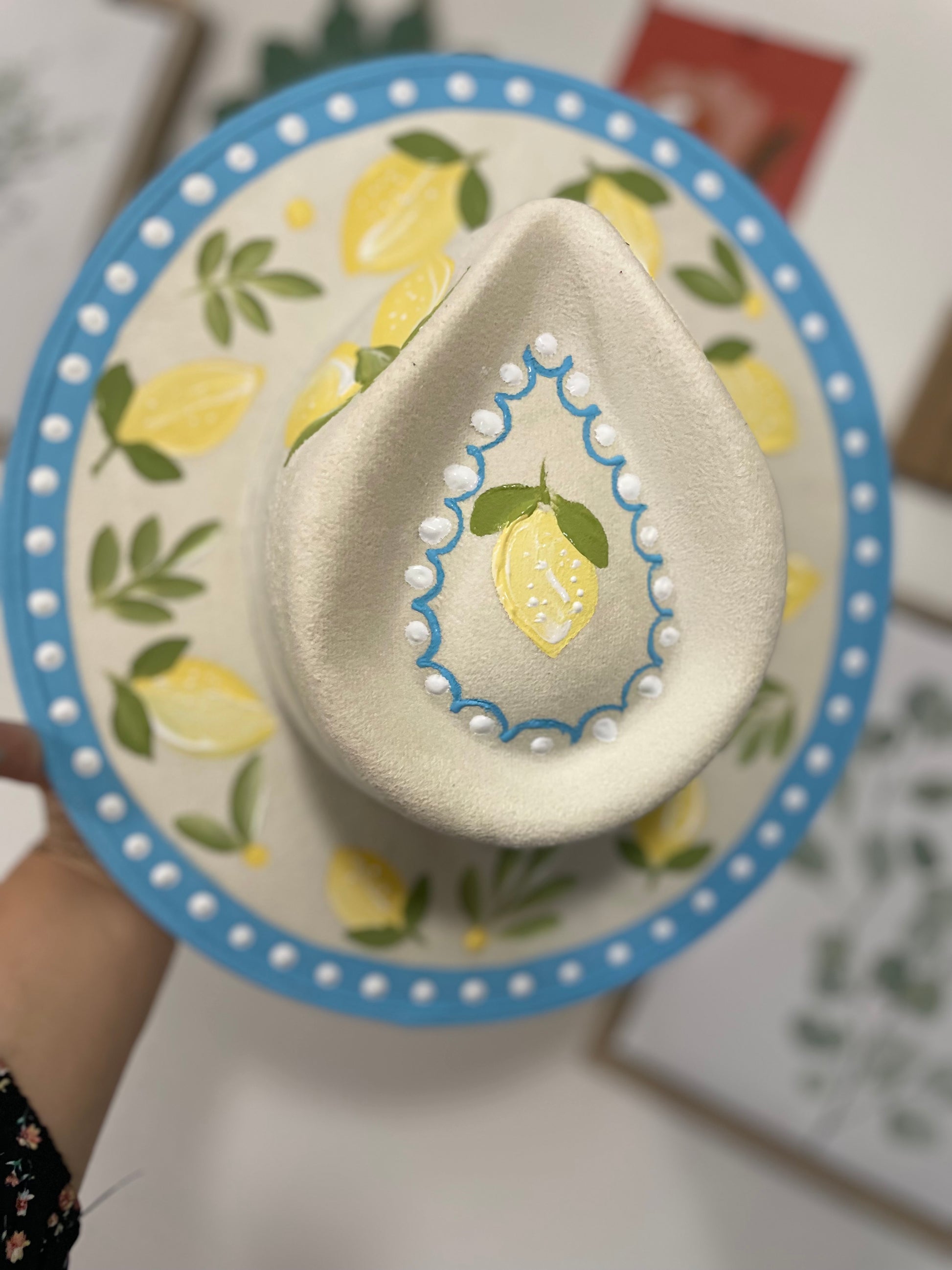 Hand painted lemon deIntroducing the When Life Gives You Lemons Cattleman - a hand-painted vegan suede hat featuring a lemon design. Enjoy the sun with confidence as this hat is sealed with a UV and water protectant. Stay stylish and protected with this unique hat.